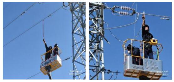 消缺小組針對(duì)塔桿高度和復(fù)雜的現(xiàn)場(chǎng)條件,決定采用高 空作業(yè)車(chē)進(jìn)行絕緣子恢復(fù)作業(yè)。作業(yè)過(guò)程中,運(yùn)維人員嚴(yán)格 遵循安全操作規(guī)程,克服高空作業(yè)的心理壓力和操作難度,