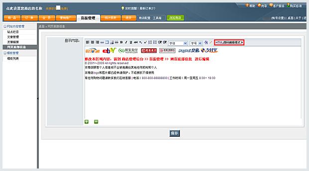 進(jìn)入SHOPEX4.8網(wǎng)站后臺(tái),選擇菜單"頁(yè)面管理"->"網(wǎng)站內(nèi)容管理"->"網(wǎng)頁(yè)底部信息",然后點(diǎn)擊窗口右上角"HTML源碼編輯模式"按鈕,切換到源代碼界面,將365webcall客服代碼加入到網(wǎng)頁(yè)底部信息代碼最后面保存即可。